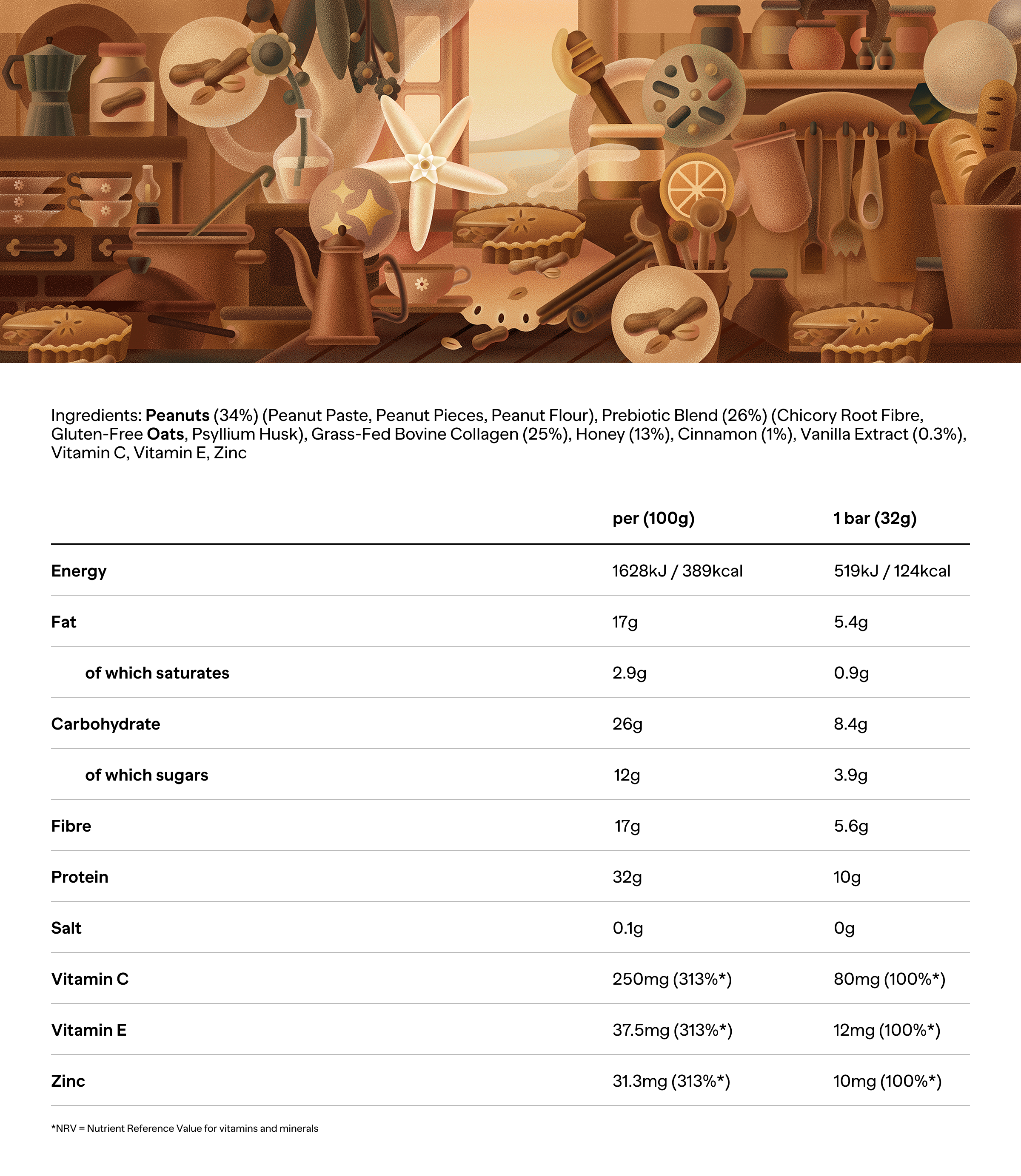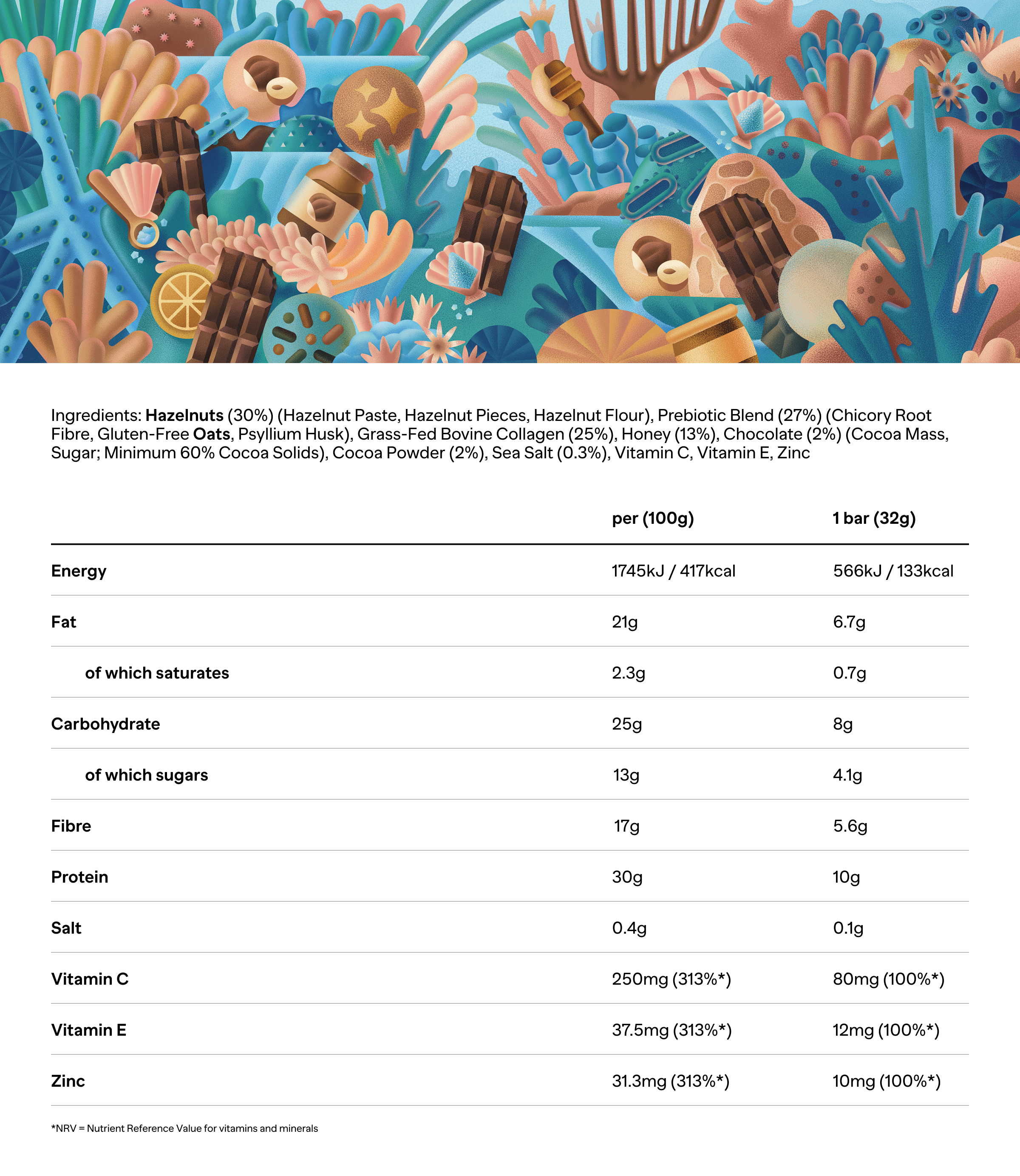 A single daily serving of the Essential Nutrition Bar can replace multiple supplements, such as collagen powders or pills, prebiotics, psyllium husk, and other gut health boosters, as well as vitamin C, vitamin E, zinc tablets, and other skin and immunity supplements. Its high protein content also makes it a convenient alternative to various protein products, including snacks and powders.