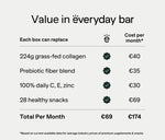 A single bar can replace multiple supplements, such as collagen powders or pills, prebiotics, gut health boosters, vitamins C, E, zinc tablets, and other skin and immunity supplements. Its high protein per calorie content also makes it a convenient alternative to various protein products, including snacks and powders.